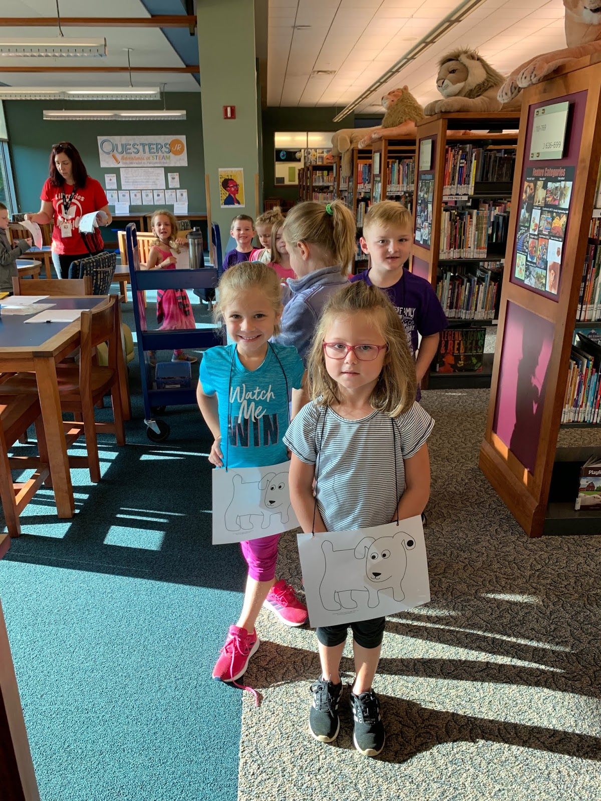 Then we got a dog necklace. We got to put dots on the necklace. When we found a dot around the library, we could add a dot to our dog.